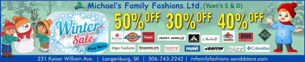 Because of increased CYBERATTACKS, we will have filed a complaint with IC3, the Crime Complaint Centre, which is run by the FBI, the Federal Bureau of Investigation in the United States of America, notifying them of Canadian crime. In Canada, we have notified both the City Police and RCMP that CYBERCRIMINALS are continually attempting to "enter in" to become an administrator in order to takeover and to control what the public can see, misleading people with old and outdated photos, and removing advertisements. Currently, we still cannot access my own Google my business listing to remove an old store photo being used without my consent and unable to upload current sales and information onto Facebook. However, new clothing & footwear styles will still continue for 2026. See our local newspapers for current advertising, including the Four Town Journal, Russell Banner, Moosomin Spectator, the Plain & Valley, the Marketplace, and more. This website only shows some clothing and footwear.